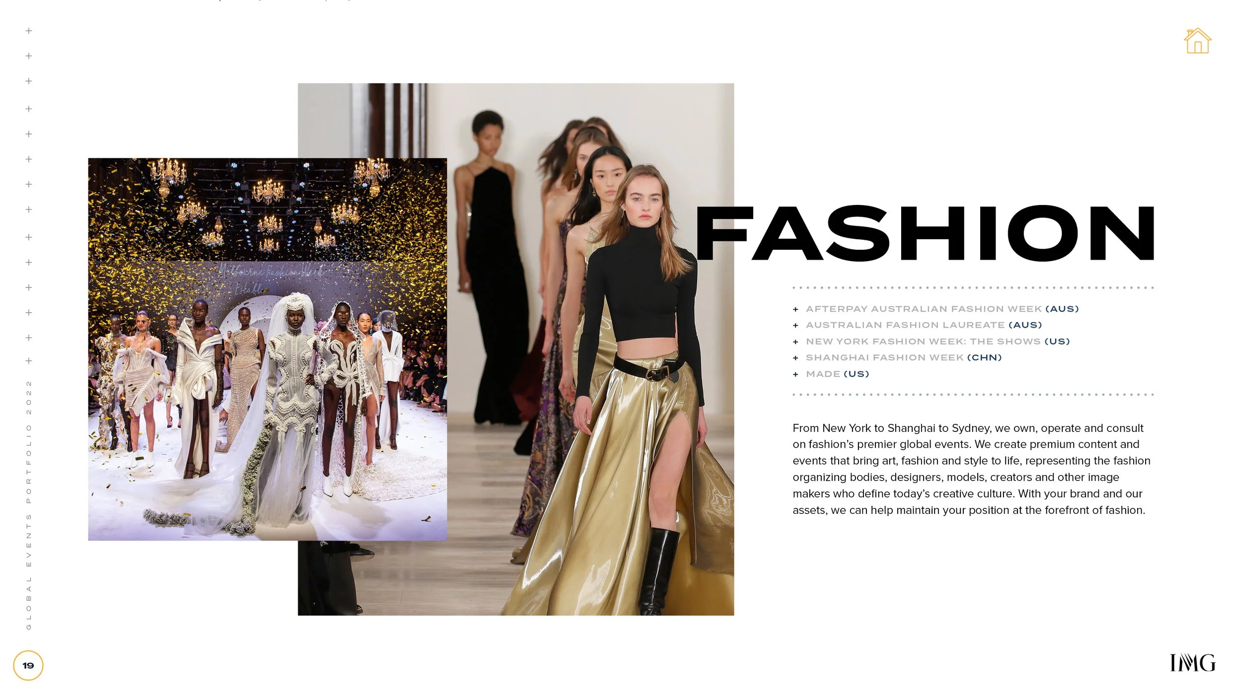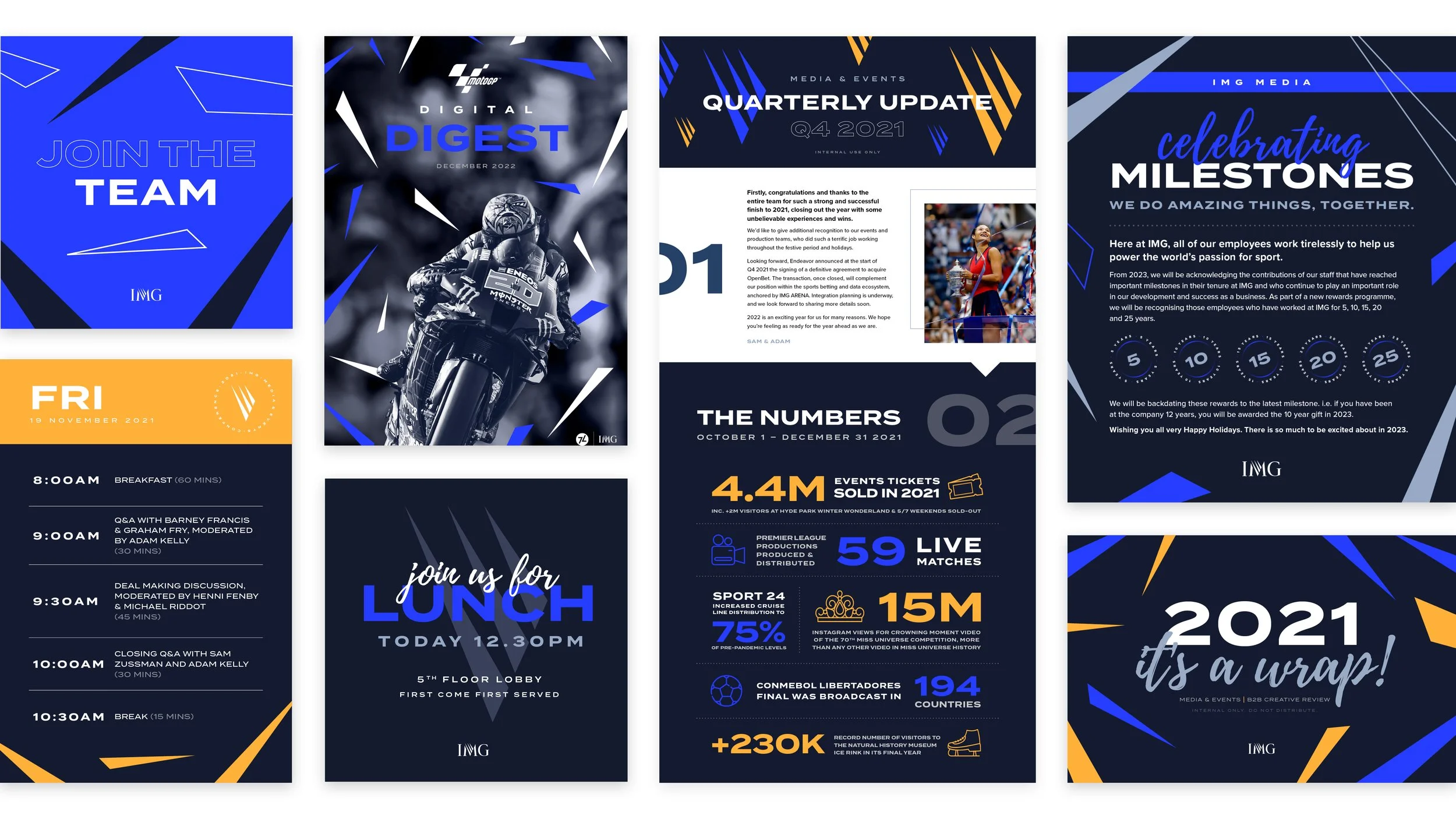 A refined set of brand guidelines was developed, highlighting IMG's legacy colours while incorporating bold typefaces and a distinctive graphic language. The visual language utilised the legacy ‘ascender’ shape found in the company’s logo which represents the company’s growth, strength and unity. This identity was applied across presentations, internal newsletters, event branding, office posters and social media posts.