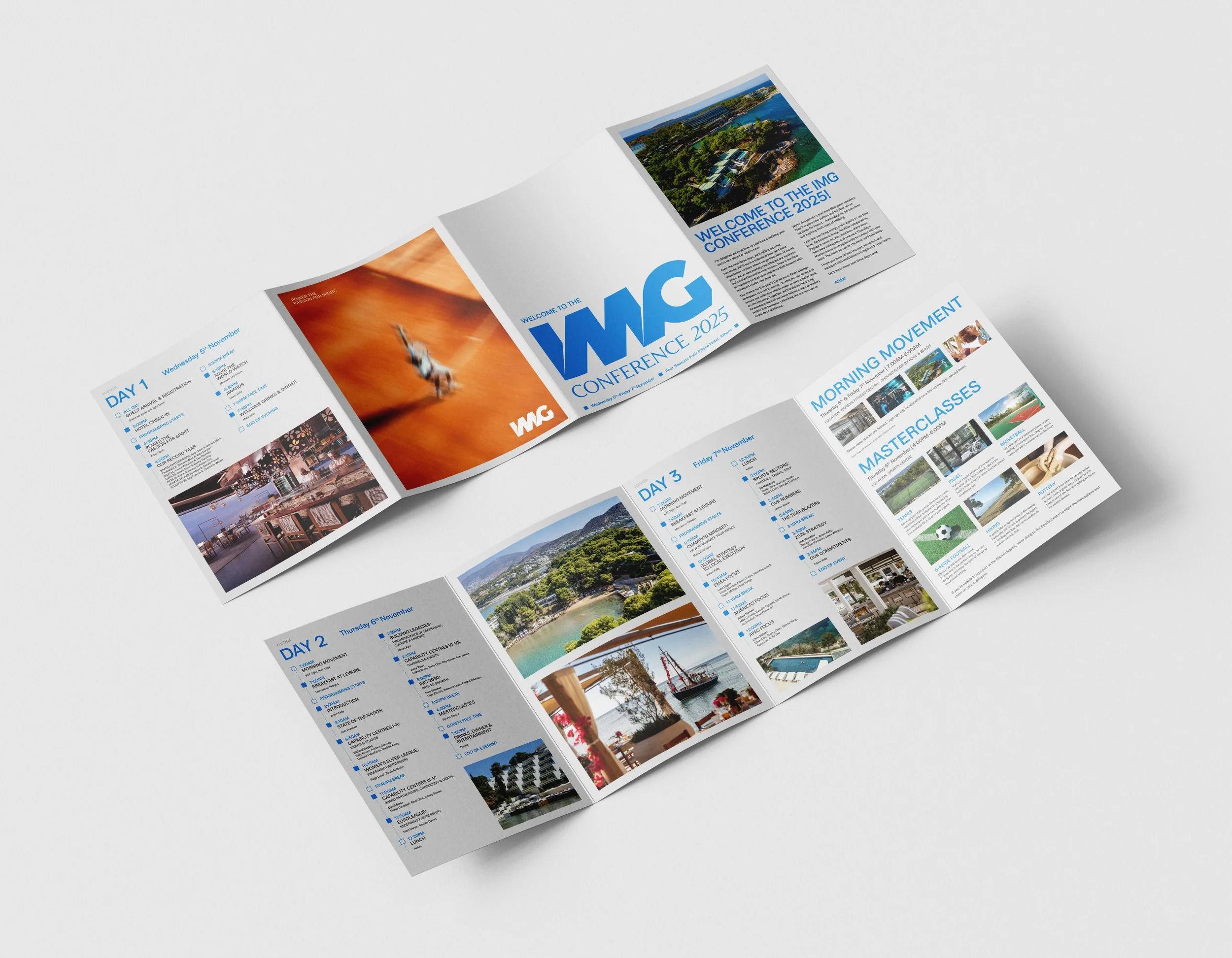 To design and direct the event identity for the internal IMG Conference, held at the Four Seasons Astir Palace Hotel in Athens, Greece. The event spanned over three days with keynote presentations, panels, extra-cirricular activities & entertainment.