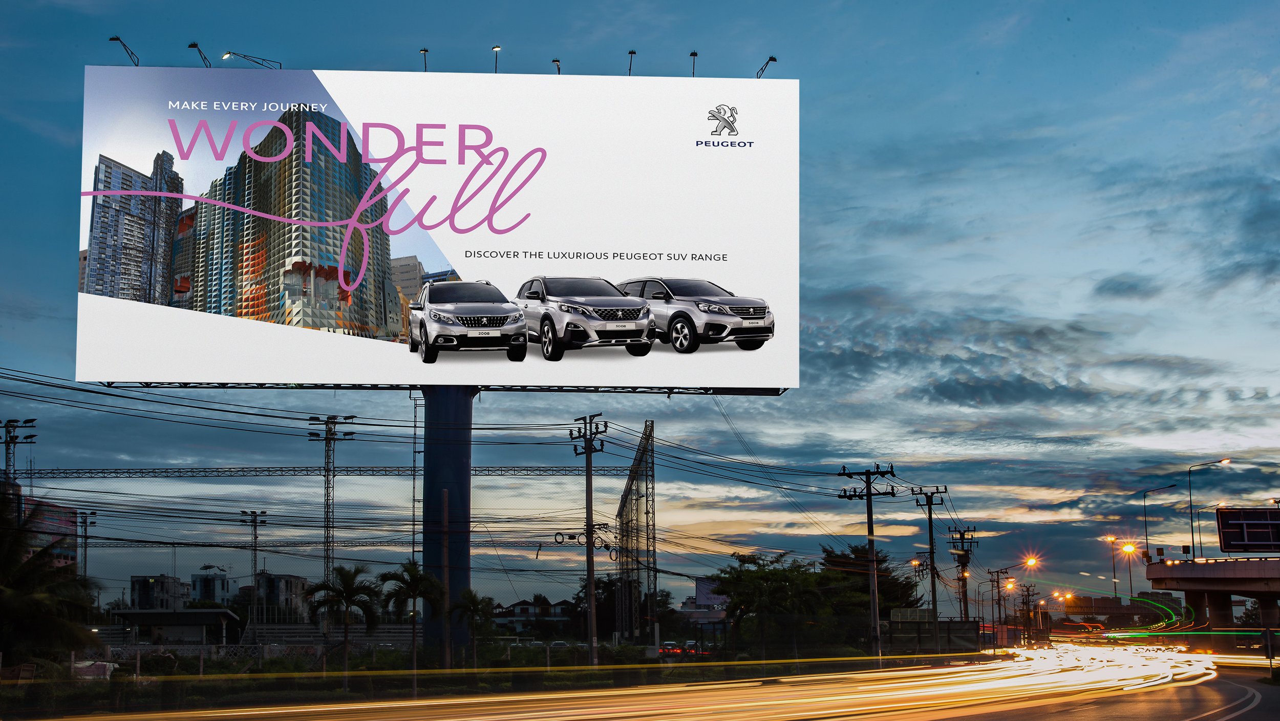 Inspired by the SUVs' innovative features (sunroof, night vision, i-Cockpit) to create a visual 'window' into the users experience whilst driving these vehicles. The campaign needed to adapt across various communication channels, including OOH, print, digital assets, and in-store branding.